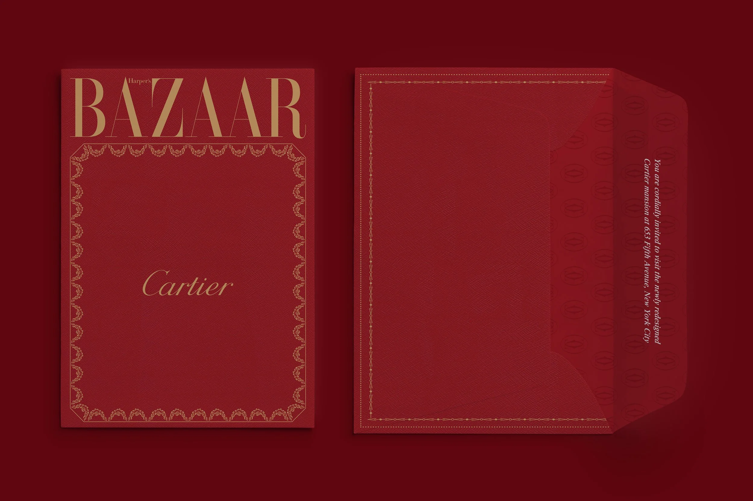 Promotional envelope announcing the opening of the newly redesigned Cartier Fifth Avenue Mansion for the September issue of Harper’s BAZAAR. Inspiration for the envelope came from the classic pattern, texture and color of the Cartier jewelry box.