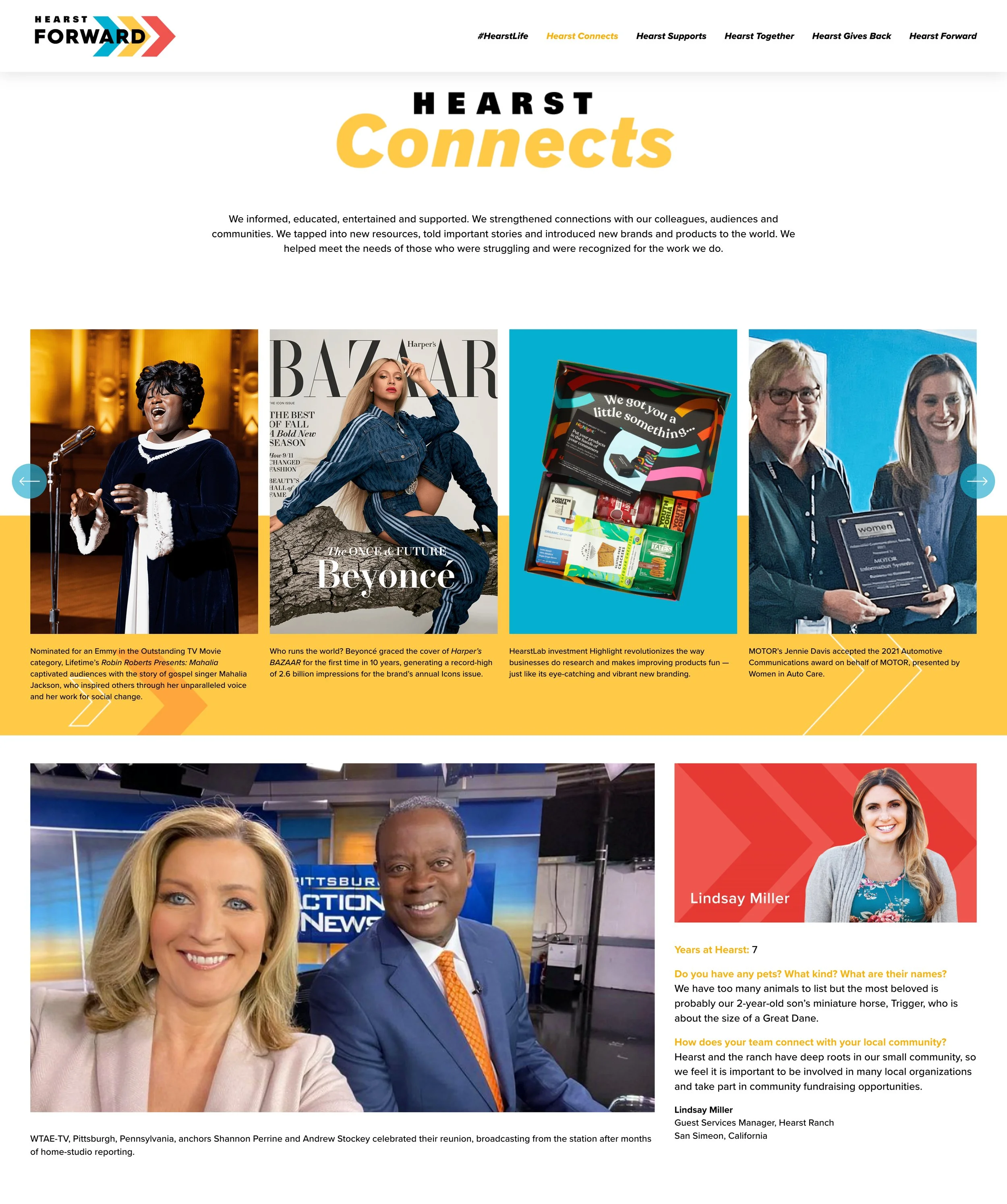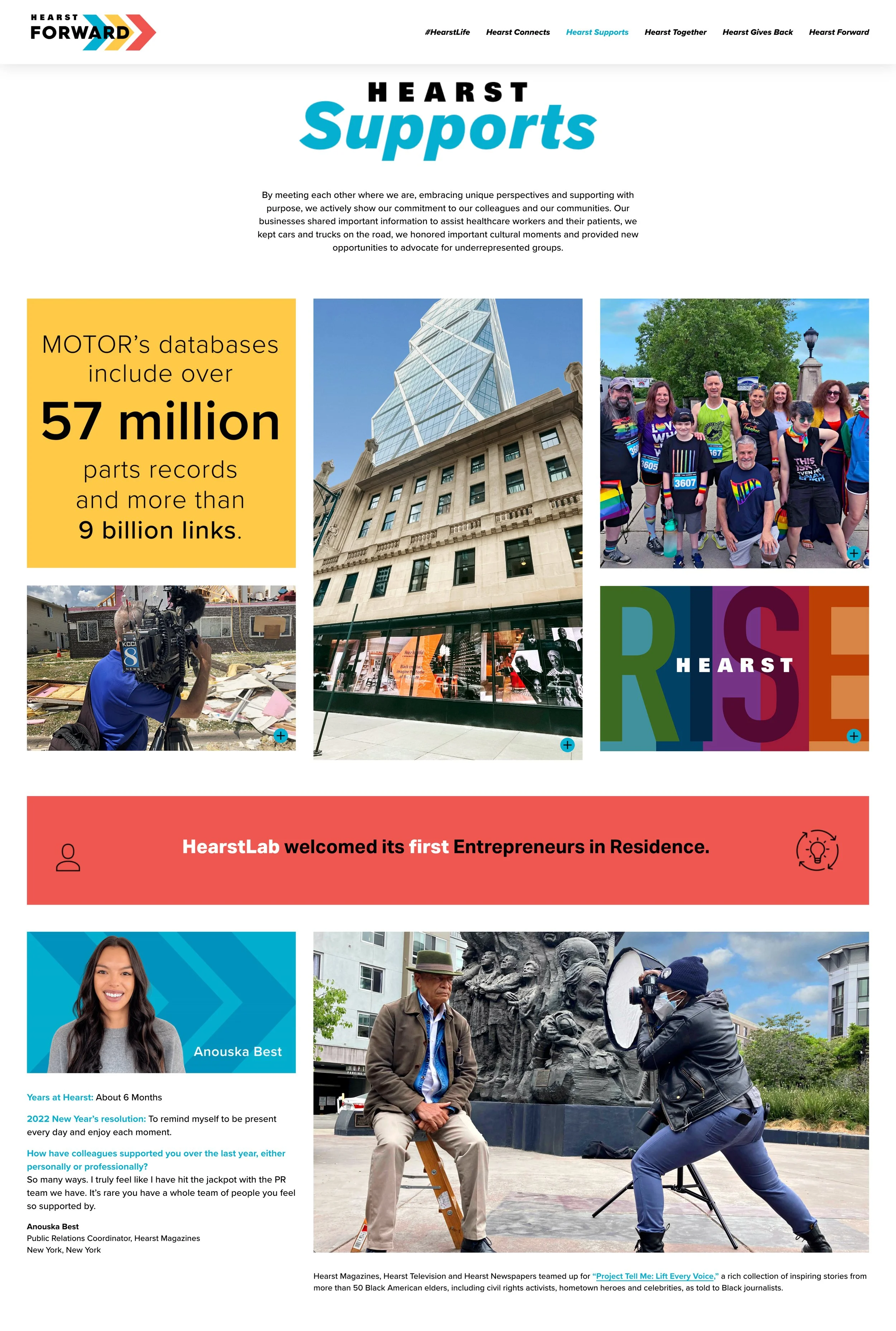 Hearst’s 2021 Annual Report is a representation of the company’s culture, colleagues and accomplishments for 2021. The Report is a live website that features imagery and original videos highlighting the main themes of that year.
