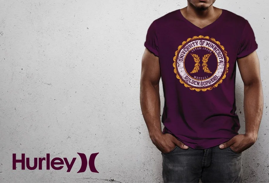 Men’s t-shirt designs for Hurley’s collegiate apparel market. The target audience focused on college students and Hurley’s existing customers. The goal was to create an abstraction of the original Hurley logo, which I used inspiration from the laurel wreath. Another important factor of the design was to make the text easy to change for a variety of universities.